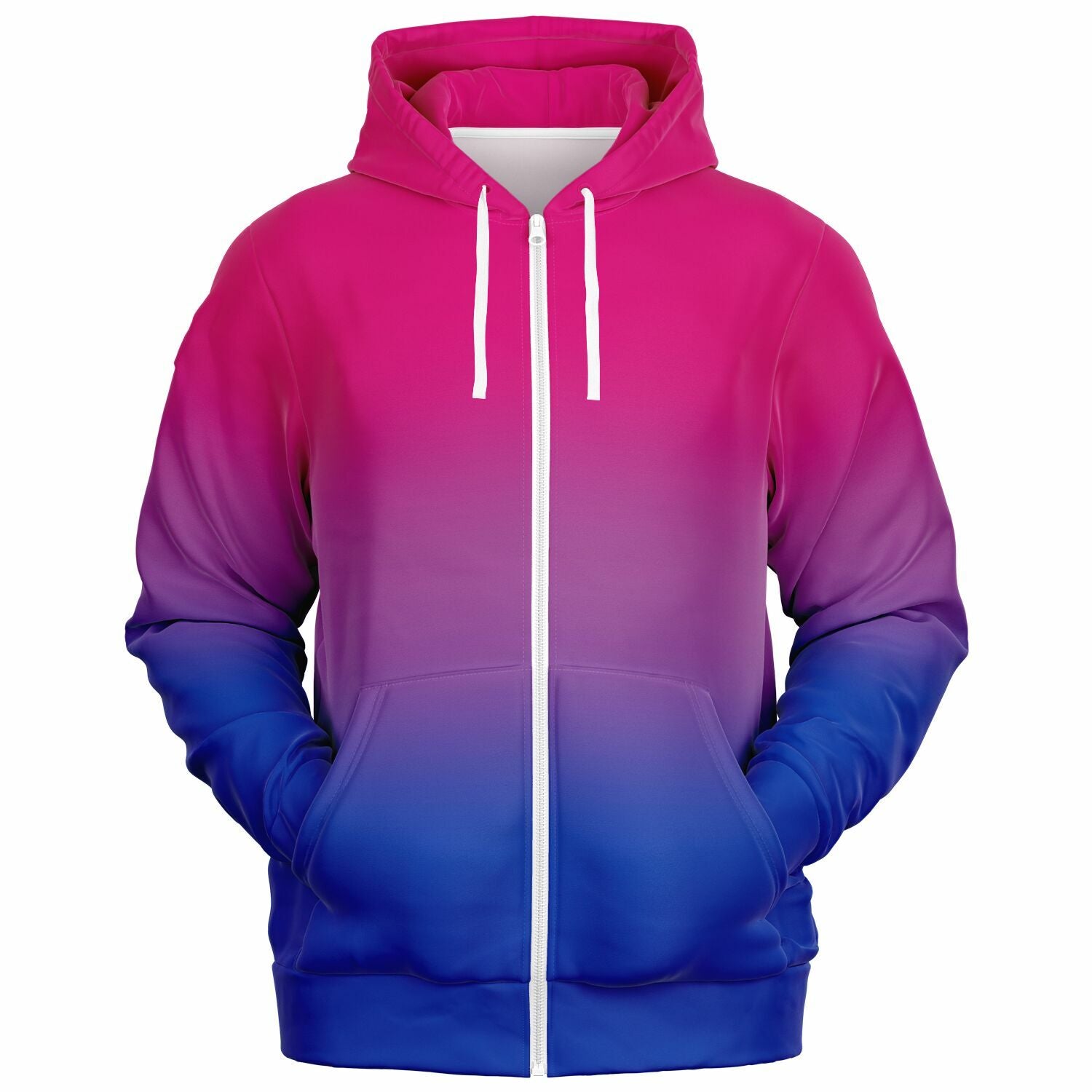This soft and cozy full-zip hooded sweatshirt is dyed in our most loved ombre gradient of the Bisexual and Biromantic pride colors. Perfect for anyone looking for a subtle way to wear your Bi+ pride on those chillier days.