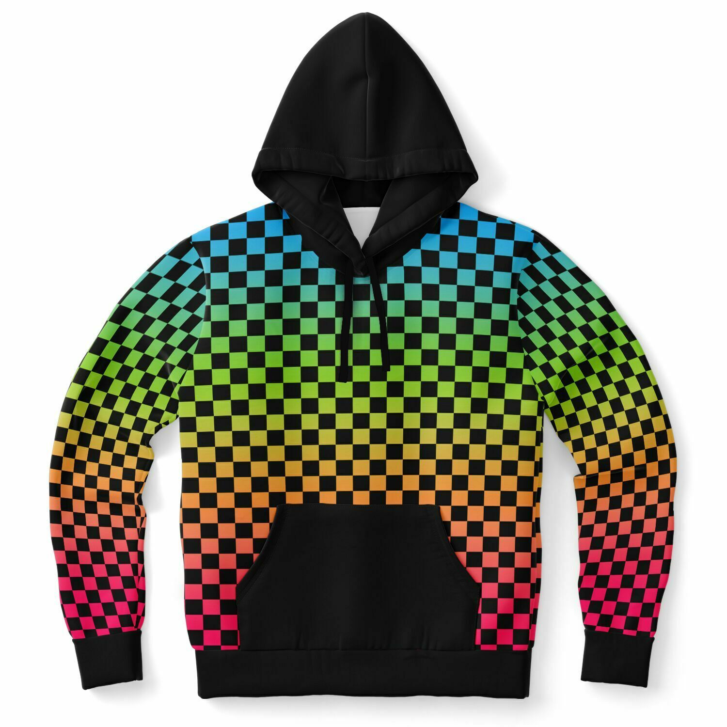 Soft and cozy pullover hooded sweatshirt in a unique black checkered pattern with the Panromantic pride colors.